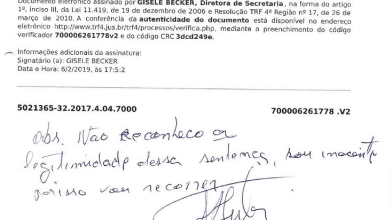 "Não reconheço a legitimidade dessa sentença, sou inocente, por isso vou recorrer", escreveu Lula ao assinar o documento. A publicação do Twitter diz que o ex-presidente recebeu "mais uma sentença política".